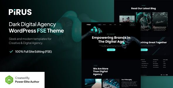 Pirus is a bold and stylish FSE (Full Site Editing) theme powered by Gutenverse. Designed for digital agencies, creative studios, portfolios, and freelancers, Pirus combines a modern dark aesthetic with powerful functionality to help you showcase your work and services professionally.